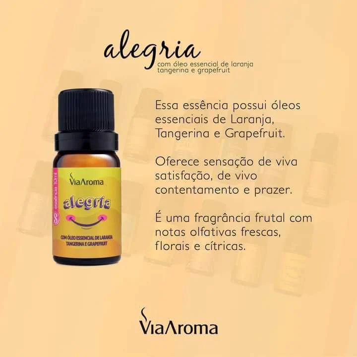 A Essência Alegria Via Aroma é possui adição de de , e . A presença dos óleos essenciais oferece sensação de viva satisfação, de vivo contentamento e prazer, despertando sentimentos de alegria. Sua fragrância é floral frutal com notas olfativas frescas, florais e cítricas.