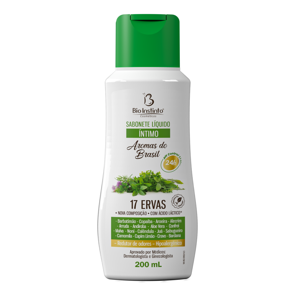 O Aromas do Brasil Sabonete Líquido Íntimo 17 Ervas Bio Instinto possui sistema pH Control, que mantém o pH íntimo equilibrado por 24 horas.